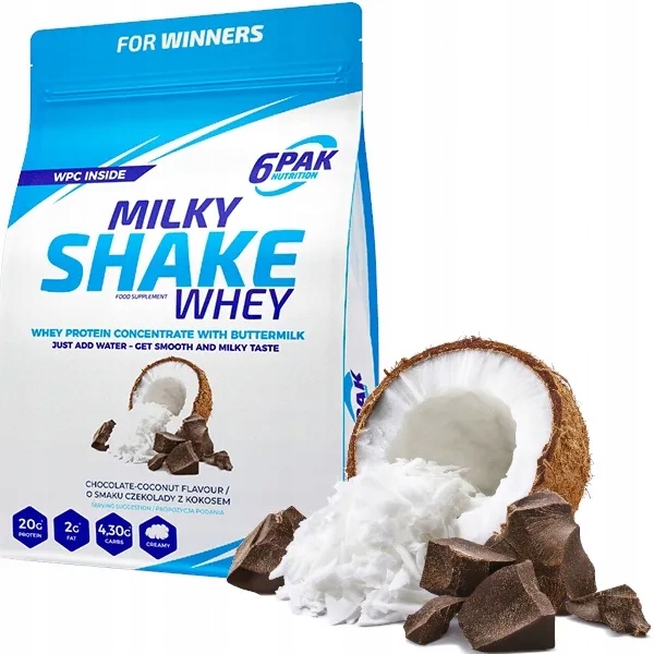 6PAK Nutrition Milky Shake Whey. Suplement diety. Odżywka białkowa. Zawiera substancję słodzącą. Najwyższej jakości odżywka białkowa na bazie koncentratu białka serwatkowego, dostępna w kilkunastu wybornych smakach. To idealna odżywka białkowa dla osób, które wyczynowo zajmują się sportem, zwłaszcza podczas treningów siłowych, wytrzymałościowych i wydolnościowych. Formuła instant umożliwia szybkie i łatwe przygotowanie smacznego shake’a. Wart podkreślenia jest również fakt, że odżywka białkowa Milky Shake Whey zawiera dodatek maślanki.