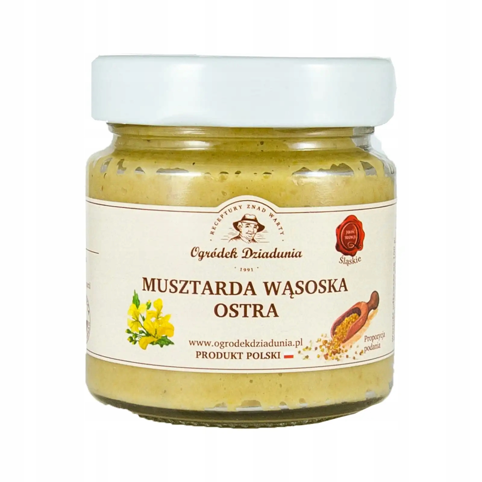 Musztarda Wąsoska Ostra to propozycja dla koneserów intensywnie pikantnych smaków. Musztarda powstała w oparciu o unikalną, domową recepturę, z najlepszej jakości naturalnych składników.